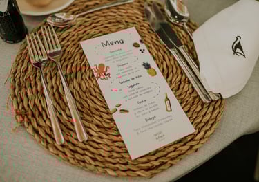 Cada plato merece su presentación. Creamos menús y minutas con encanto, pensados para integrarse en la decoración y hacer que hasta la espera entre platos sea bonita.